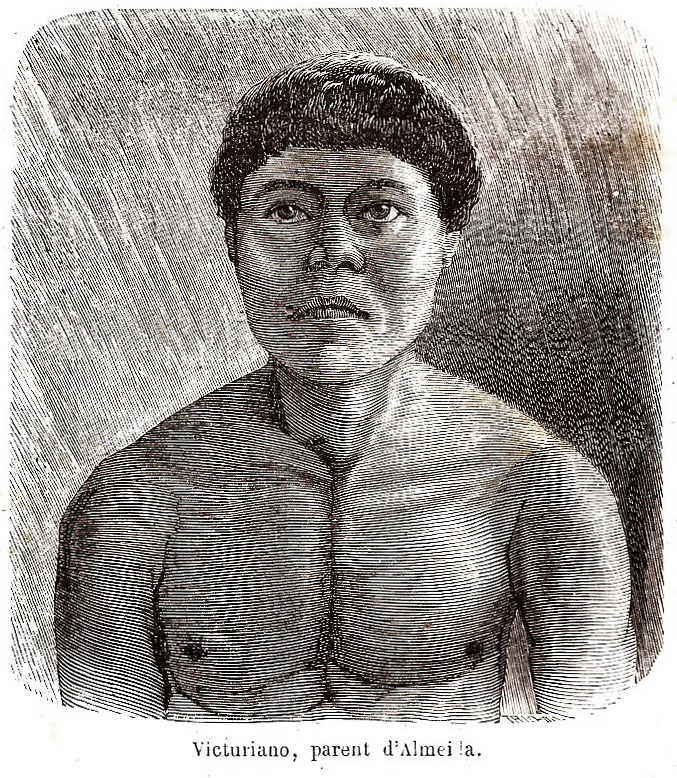 Um dia, preparando bichos à luz dos frascos de colódio, a chama, levada por uma corrente de ar, entrou em contacto com um litro de éter; não fui ainda dessa vez ferido pela explosão; mas o meu telhado pegou fogo; só tive tempo de saltar em cima de um grande tacho d’água e apagar o incêndio, queimando os dedos e um pouco o cabelo. Com o resto dos meus produtos químicos, refiz a carga habitual. Nesse dia eu estava na tenda, de joelhos, trabalhando, quando ouvi vozes; havia gente falando com Manoel. Qual não foi minha surpresa quando, pondo a cabeça à porta, vi, ao invés de algum caçador com seu fuzil, como acontecia às vezes, uma dúzia de selvagens botocudos, de lábios deformados e orelhas de meio pé de comprimento. Certamente não compreendiam nada nessa tenda em que, em pleno dia, a luz ficava acesa. Foi bem pior quando viram surgir dali uma cabeça raspada e uma barba comprida. Manoel já lhes contara o que eu era; mas a ciência deles não bastava para entenderam o que eu fazia.