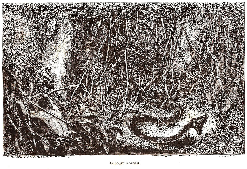 O dia passamos assim, subindo a corrente com entreatos de marcha na mata, com risco de afundarmos no lodo ou nos arranharmos depois. Numa das primeiras caminhadas, o índio que ia na minha frente estendeu a mão fazendo-me parar, que é o que eu ia fazer por mim mesmo, porque um imenso tronco de árvore bloqueava a passagem. Esse homem só tinha o fuzil para proteger da água; não o tinha largado, limitando-se a levantá-lo de quando em quando, para que não se molhasse; apontou então e atirou à queima-roupa em alguma coisa embaixo do tronco de árvore que eu me preparava para transpor. O que saiu de lá me fez recuar precipitadamente. Caí para trás no meio de um monte de espinhos. A dor me pôs de pé rapidamente, tanto mais que eu estava pela primeira vez em presença dessa cobra tão perigosa, a surucucu. Ela estava mortalmente ferida. O monstro parecia ter doze pés de comprimento; partia com a cauda tudo que estivesse ao seu alcance; a cabeça, da grossura de um focinho de porco, se erguia, e ela fazia esforços para dar o bote, mas em vão; a coluna vertebral estava quebrada. Lembro-me como se fosse ontem da impressão que produziu em mim essa bocarra aberta, exibindo dois dentes com veneno, cujo mais leve golpe nos teria matado instantaneamente. Ela se debateu por meia hora. Os índios queriam acabar com ela, mas minha decisão estava tomada: queria levá-la sem estragos. Vi-a lentamente enfraquecer-se; quando já não se movia mais, cortei um cipó forte, porque nem sonhava em pedir ajuda aos índios, e aproximei-me com cuidado; toquei-a na cabeça com um galho e, certo de que estava morta, passei-lhe o cipó pelo pescoço, fazendo um nó. Os índios olhavam em silêncio. Arrastei assim o monstro durante muito tempo, o que não era nada fácil; aliás, além dos diversos objetos amarrados nos meus ombros, o peso dela era grande. No entanto, o índio que a matara, que, diga-se entre parênteses, tinha sido meu solitário e único modelo,