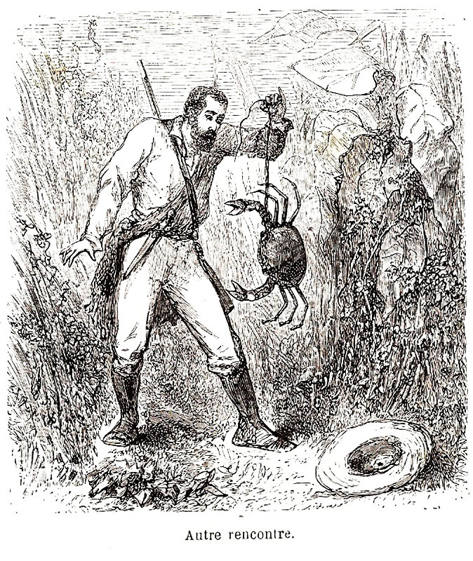 Certa manhã em que a chuva me deixara preguiçoso, eu estava em cima do colchão, meio adormecido, meio desperto; um bicho horrível me fez saltar de pé, arrancando-me desse far niente a que raramente me entregava: uma caranguejeira estava perto de mim. Essa aranha, de nove a dez polegadas de largura, peluda no corpo todo, é provida de duas presas cuja picada provoca febre durante vários dias; ela vigia e come passarinhos; o nojo não me impediu, no entanto, de acrescentá-la às minhas coleções. Também com o escorpião eu já havia travado conhecimento.
