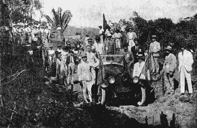 | Visita do presidente Nestor Gomes à construção da Estrada Santa Teresa-Itaguaçu, trecho próximo ao Caldeirão. Construtor: Serafim Derenzi, 1923-24. Fotógrafo não identificado. |