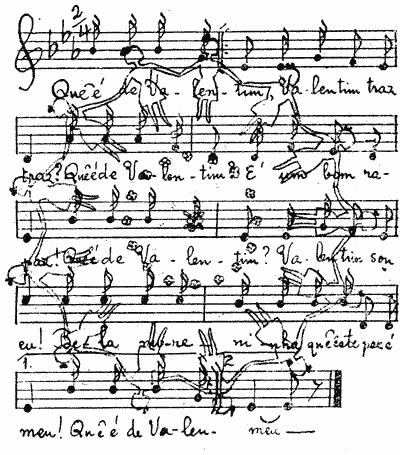 | Que é de Valentim, Valentim traz, traz? Que é de Valentim? É um bom rapaz! Que é de Valentim? Valentim sou eu! Bela moreninha Que este par é meu! |