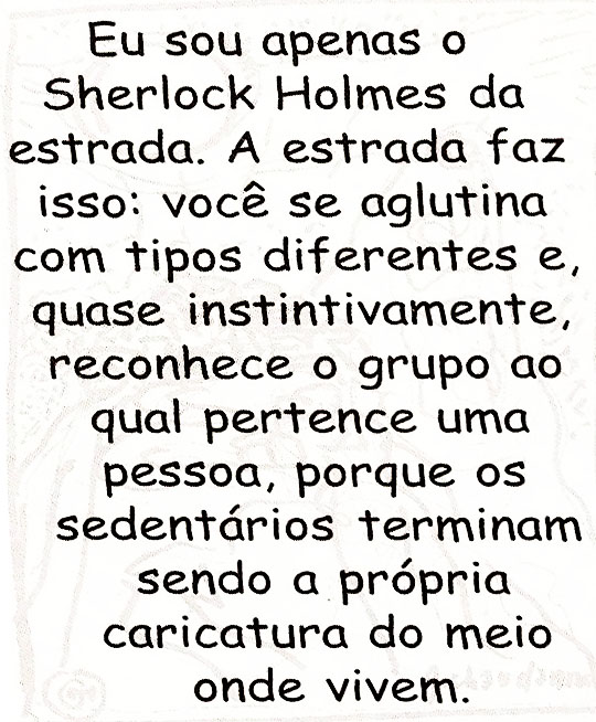 Mas não tinha nada a ver com um guru, não. Eu sou apenas o Sherlock Holmes da estrada. A estrada faz isso: você se aglutina com tipos diferentes e, quase instintivamente, reconhece o grupo ao qual pertence uma pessoa, porque os sedentários terminam sendo a própria caricatura do meio onde vivem. O maluco de estrada, não. Porque não se nutre do solo, como o sedentário-árvore, mas se nutre de algo muito mais espiritualizado: o espaço.