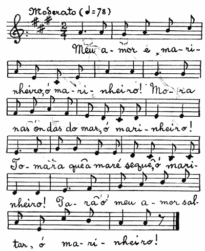 | Meu amor é marinheiro, Ó marinheiro! Mora nas ondas do mar, Ó marinheiro! Tomara que a maré seque, Ó marinheiro! Para o meu amor saltar, Ó marinheiro! |