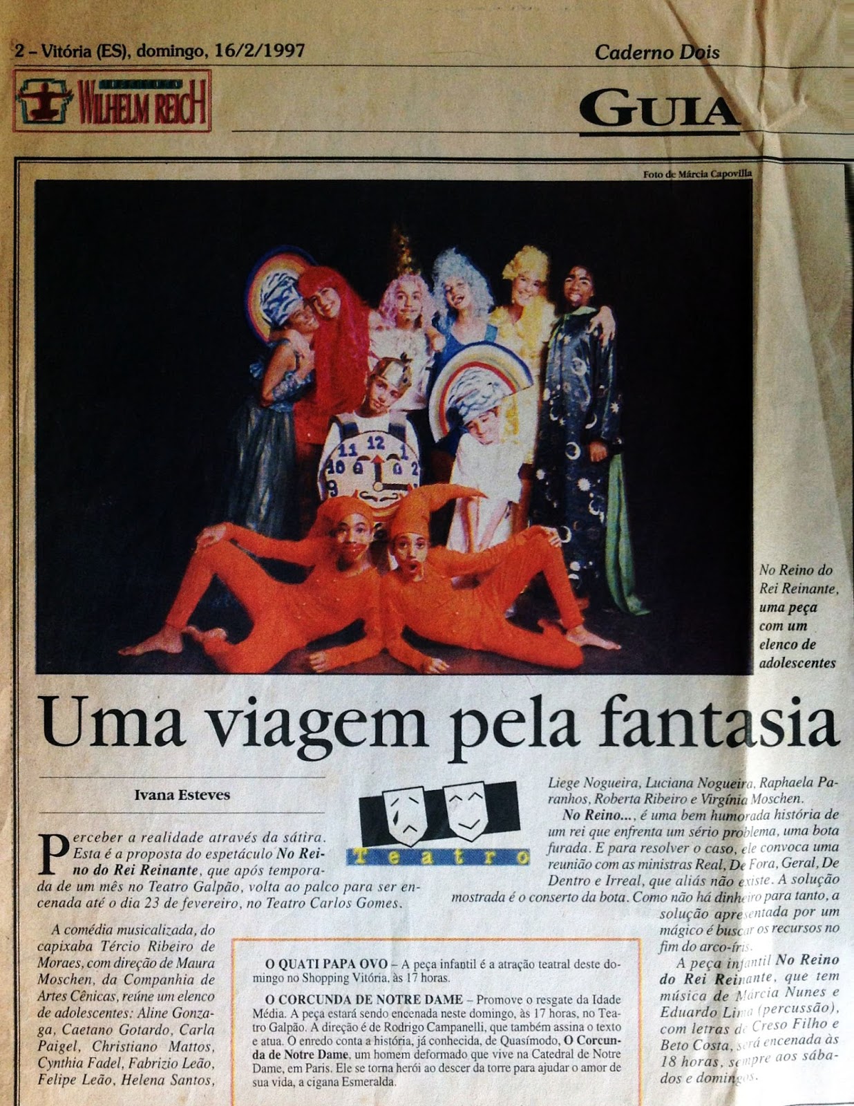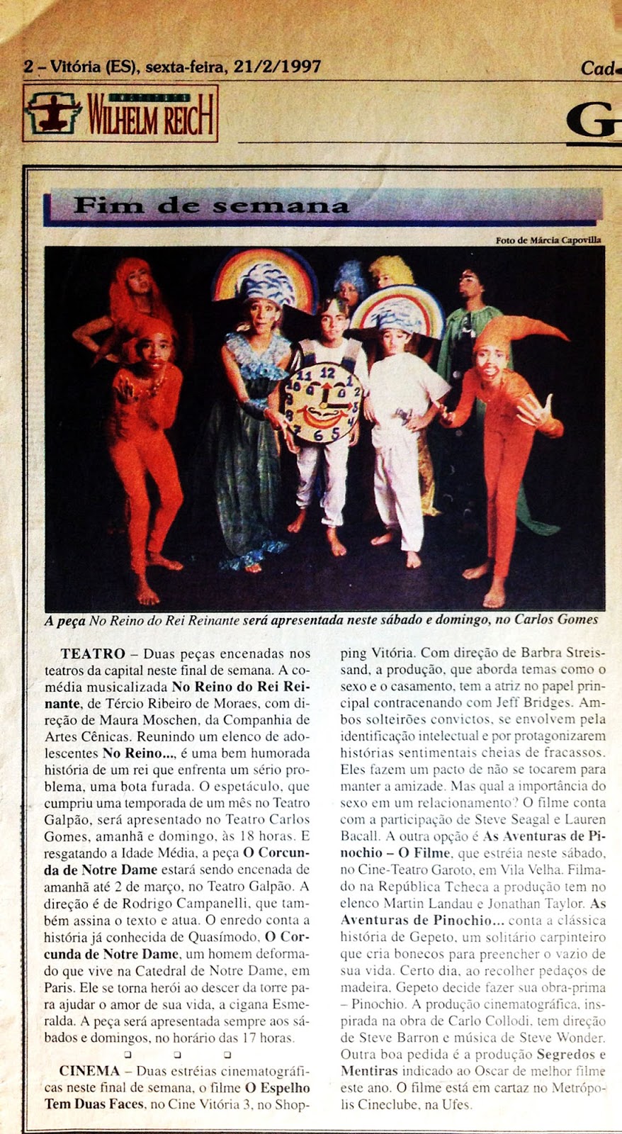 | Elenco da peça No reino do rei reinante, escrita por Tércio Moraes e dirigida por Maura Moschen. A peça foi encenada nos teatros Galpão e Carlos Gomes em 1997. Foto jornal A Gazeta, 16/02/1997. |