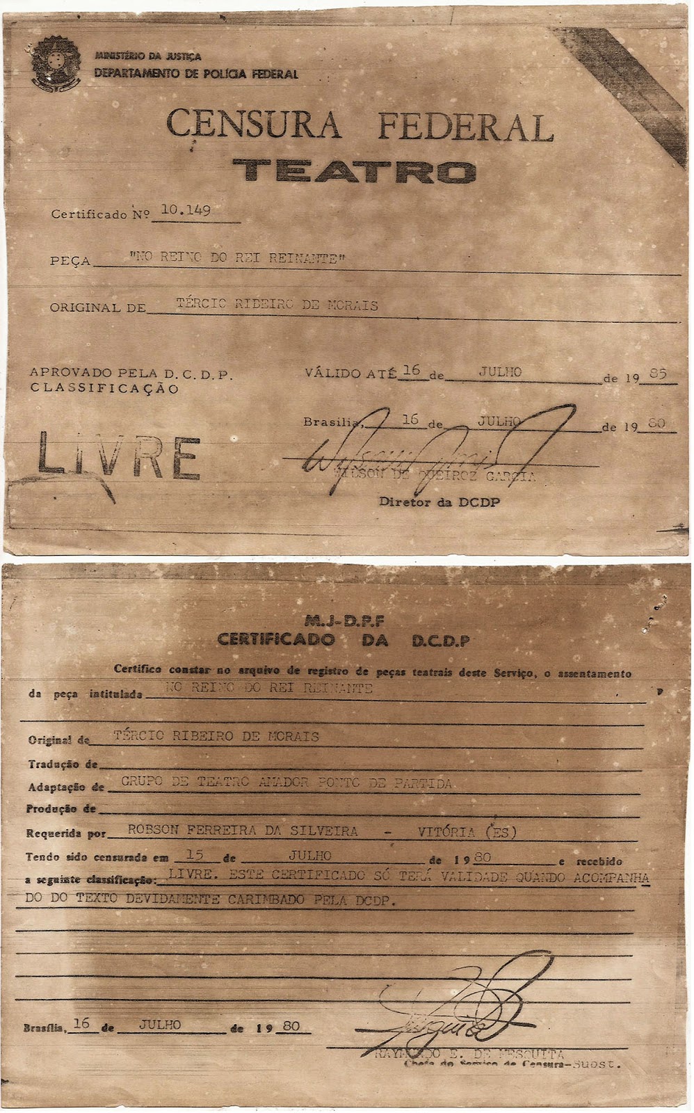 | Certificado da Censura Federal do Teatro para a peça No reino do rei reinante. 1985. |