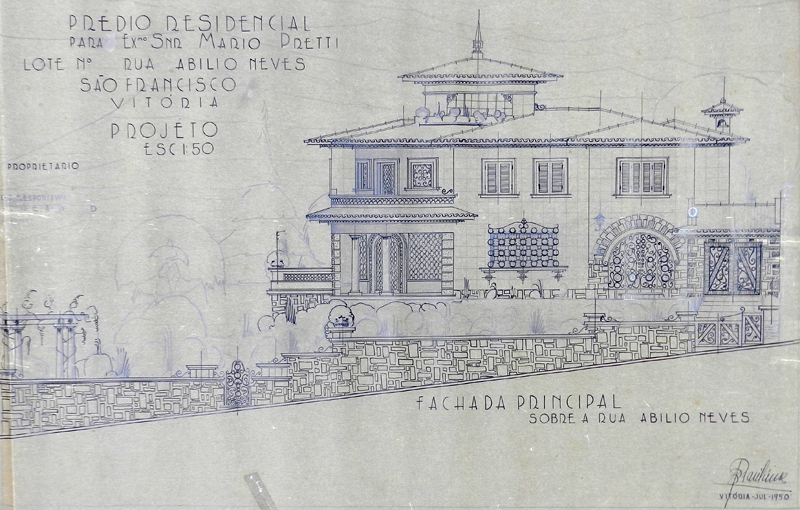 | ID 364 – Projeto de prédio residencial à rua Abílio Neves, São Francisco, Centro, Vitória, proprietário Mário Pretti, julho de 1950. |