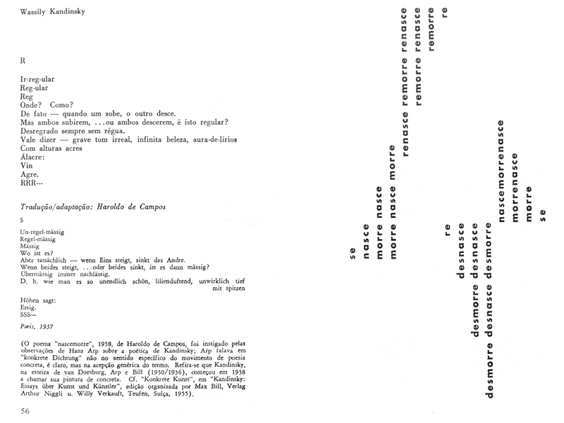 A espacialização anti-sintática e o uso de poucos vocábulos no branco da página foi a estratégia adotada pelo autor em “nascemorre”: a mesma de que os demais concretistas se valeriam, nos poemas mais ortodoxos do movimento. Tal espacialização, porém, revela mais aspectos da angústia da influência, envolvendo “S, “R”, uma nota em prosa entre parênteses a respeito de “nascemorre” e este último. Os dois primeiros textos e a nota em pauta encontram-se na página 56, enquanto “nascemorre” acha-se na página 57 (que aparece sem numeração) da Teoria da poesia concreta. Considerando-as como um conjunto gráfico unificado, temos uma página dupla, com os três poemas diante dos nossos olhos. Notaremos, então, ao menos quatro detalhes interessantes: 1º) “R” precede “S”, a tradução/adaptação de Haroldo vem impressa na metade superior, ao passo que o original em alemão de Kandinsky se acha na metade inferior da p. 56, e não o contrário (aliás, bem a propósito, lemos em “R”: “De fato — quando um sobe, o outro desce”…); 2º) o corpo das letras de “R” é notavelmente maior do que o das de “S”; 3º) disposto na vertical, “nascemorre” ocupa toda a extensão gráfica da página 57, igualando-se, em tamanho, ao grupo constituído por “R”, “S” e a nota explicativa; 4º) logo ao fim de “S”, há um dado paratextual: “Paris, 1937”, data da sua presumível redação; após essa data, a nota parentética inicia-se com palavras que também trazem uma datação: “O poema ‘nascemorre’, 1958, de Haroldo de Campos […]” (in: CAMPOS, CAMPOS, PIGNATARI, 1975, p. 56). Levando tudo isto em conta, observamos uma certa colocação em segundo plano da composição “S”, de Kandinsky, através da sua “miniaturização” tipográfica e do seu “cerco” efetuado pela fronteira da tradução/adaptação “R”, a da nota sobre “nascemorre” e, ainda, a deste poema que, aliás, é o que mais chama a atenção, visualmente falando, no conjunto textual formado pelas páginas 56 e 57.